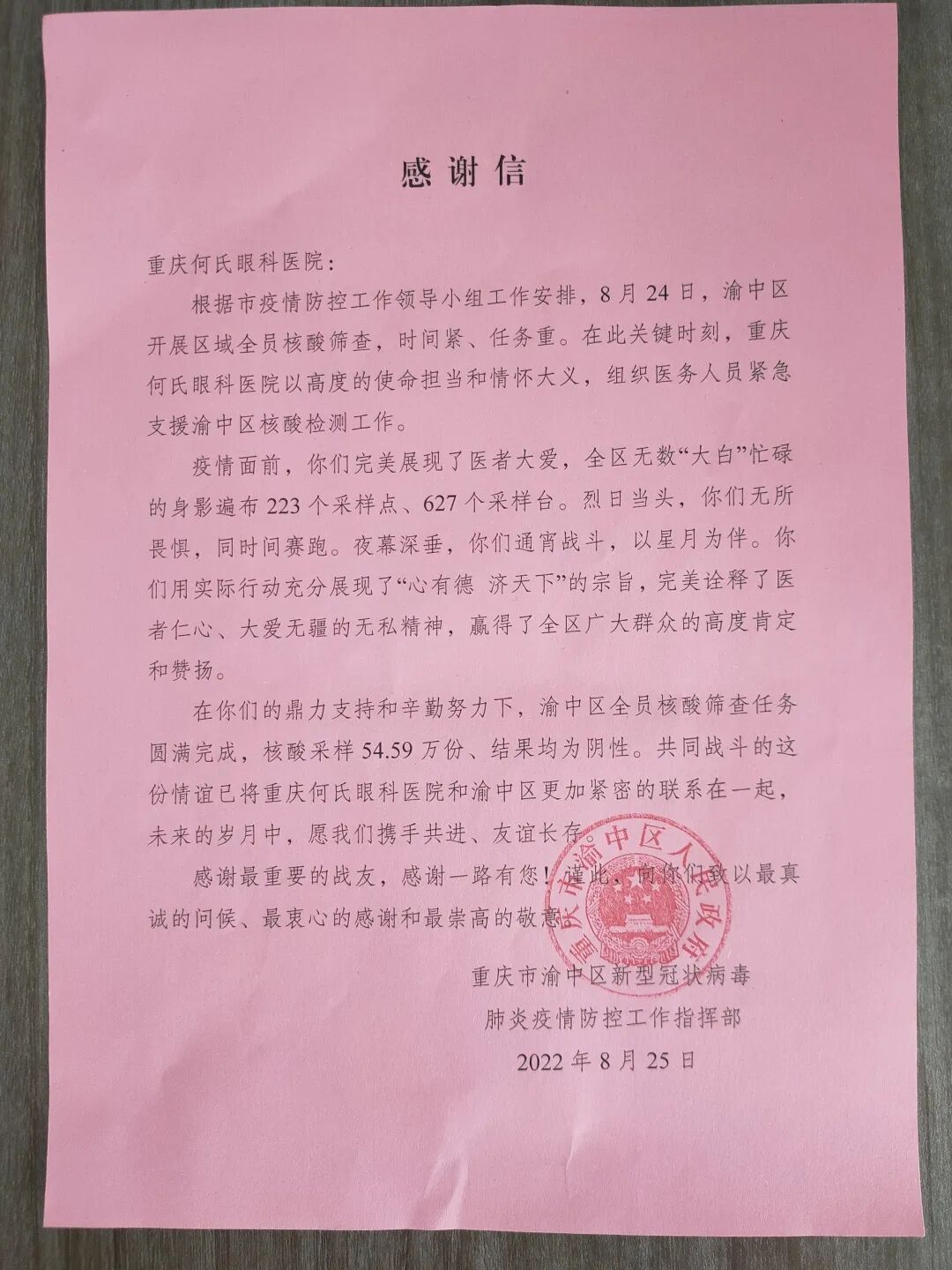 近日,重庆何氏眼科医院收到一封来自重庆市渝中区人民政府的感谢信,信中表示,在抗“疫”关键时刻,重庆何氏眼科医院以高度的使命担当和情怀大义,迅速集结医务人员奔赴疫情防控第一线,为打赢疫情防控阻击战提供了有力的支持和帮助,用实际行动充分展现了“心有德济天下”的宗旨,完美诠释了医者仁心、大爱无疆的无私精神,对我院支援核酸采集任务的所有医务工作者致以了衷心的感谢和崇高的敬意。